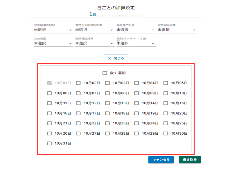 日ごとの加算設定で複数日付が設定可能になりました。月の途中で加配加算を変更しなければならないときなど、従来は一日ずつ設定が必要でした。