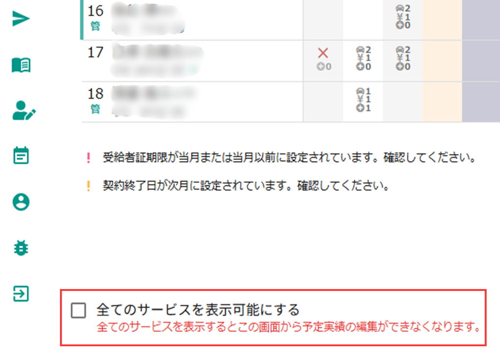 全サービス表示すると編集機能が使えなくなります。また、保育所等訪問支援をふくむ事業所での全サービス表示は出来ません。