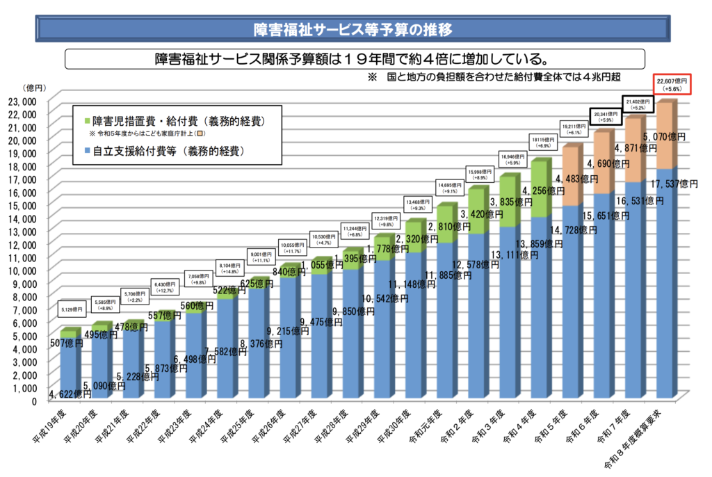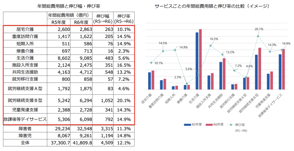 令和6年度の障害福祉サービス総費用額は、前年度比で12.1%増という急激な伸びを記録しました 。 政府はこれまで年5〜6%程度の伸びを想定して予算を確保してきましたが、実際の費用はその想定を大きく上回っています 。この急増を抑制し、制度の持続可能性を確保することが今回の臨時改定の主な目的です 。