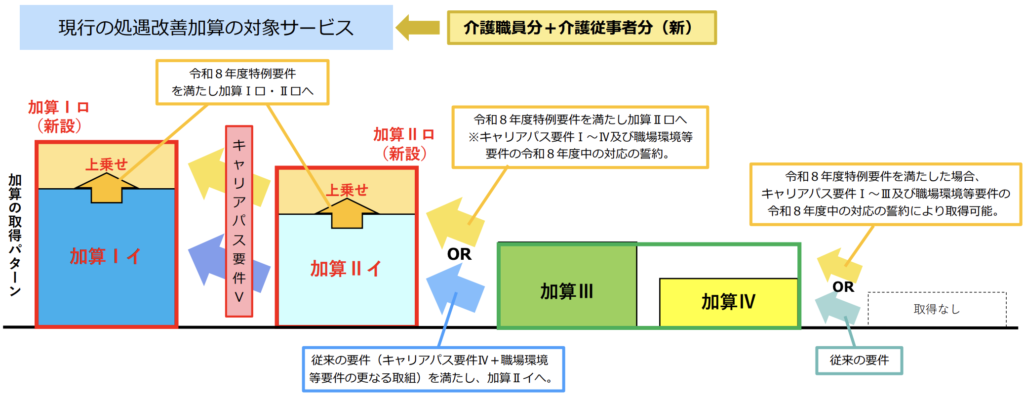 処遇改善分については、現在以下の「3階建て」の構造案が提示されています。これらを合算すると、月額最大で約1.9万円相当の引き上げとなる設計案です。