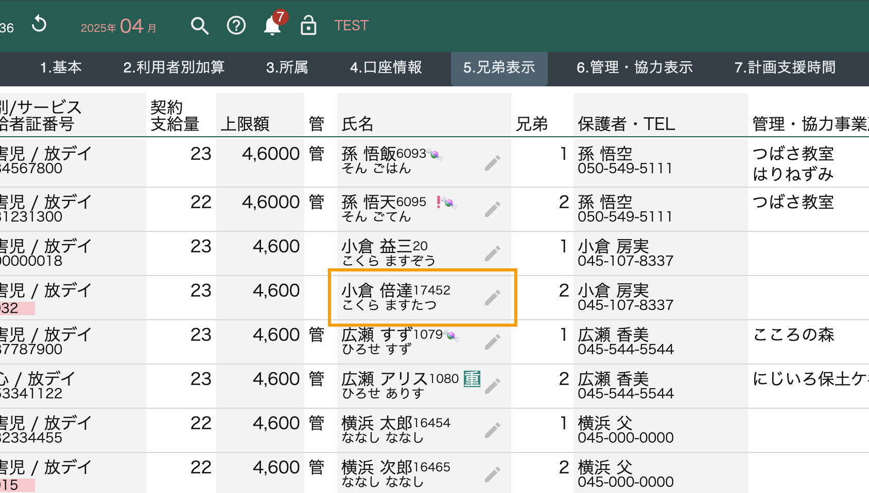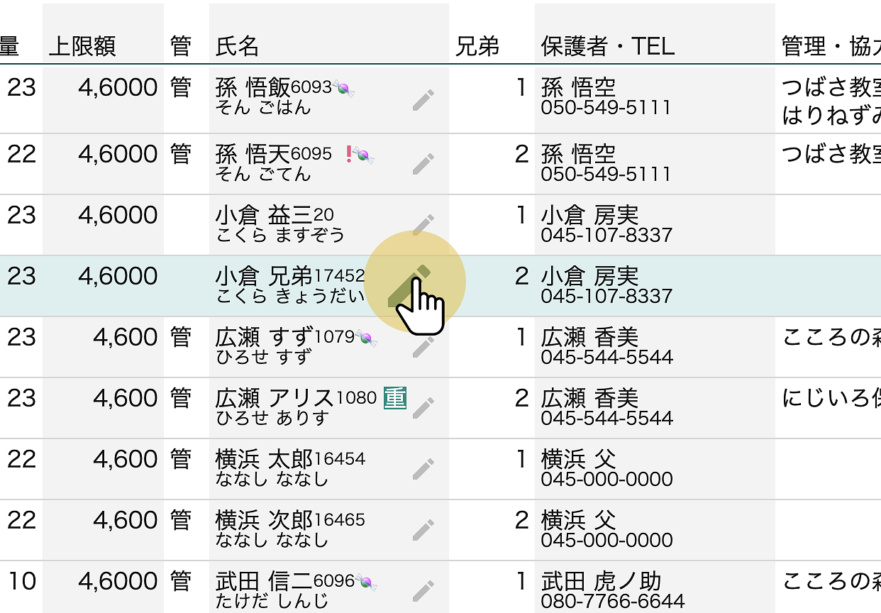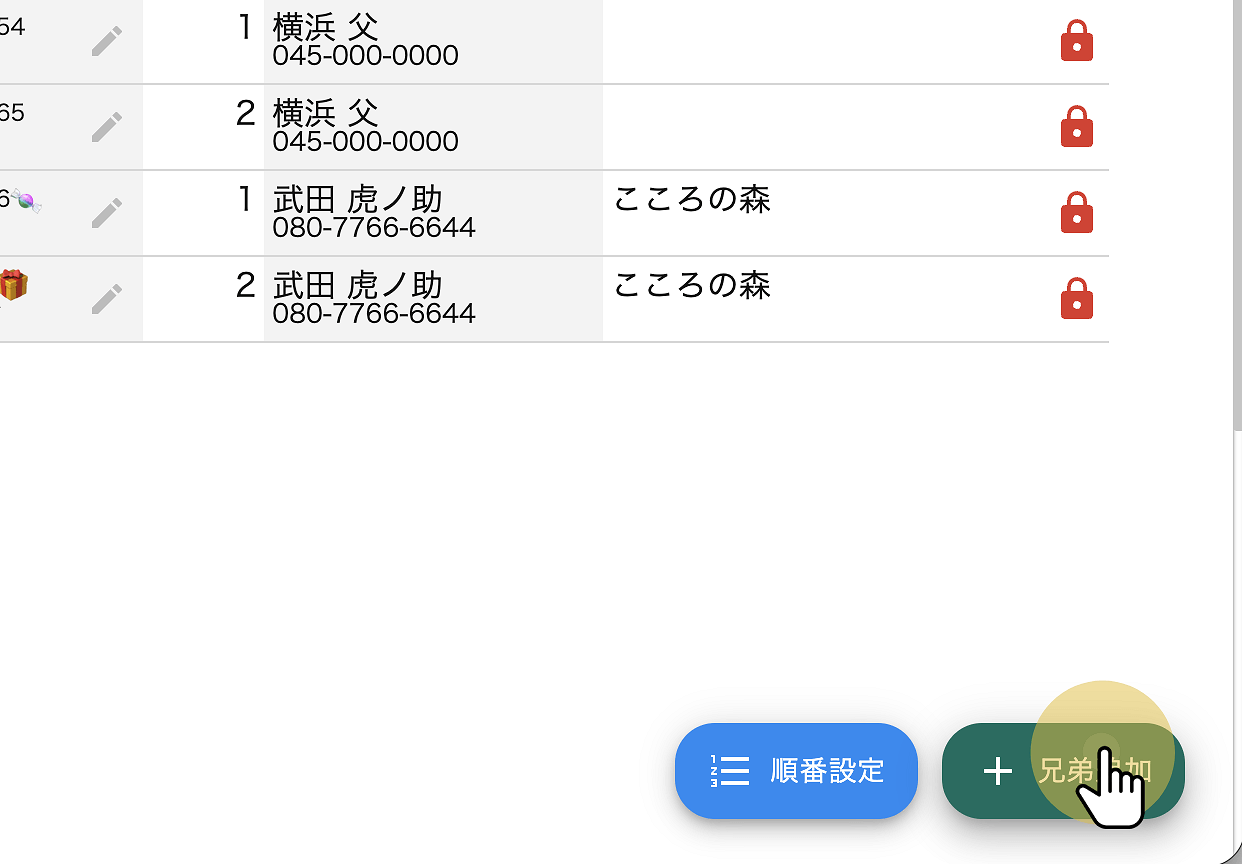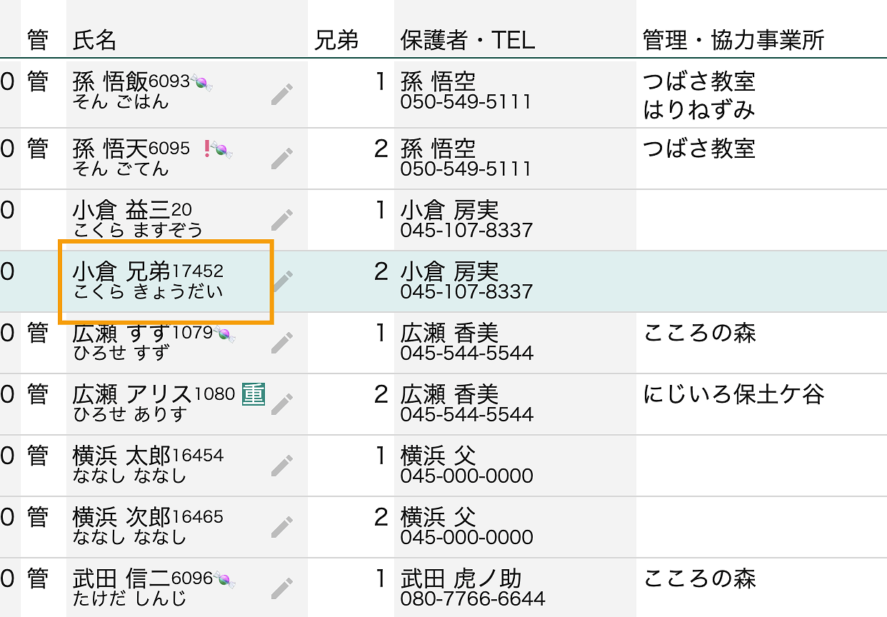 任意の利用者に兄弟を追加出来ます。兄弟は保護者のお名前や電話番号が一致している必要があり、間違えが発生しやすいです。確実に兄弟を追加することが出来ます。