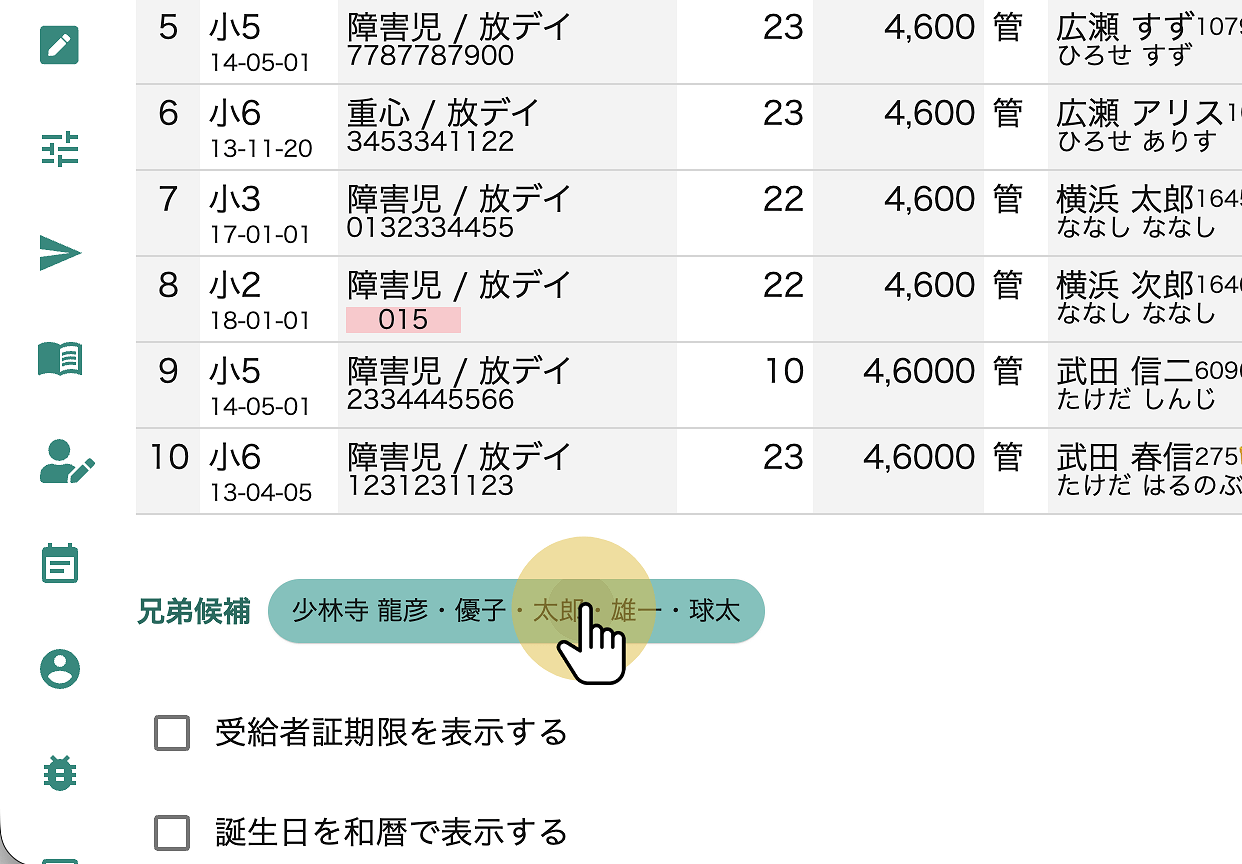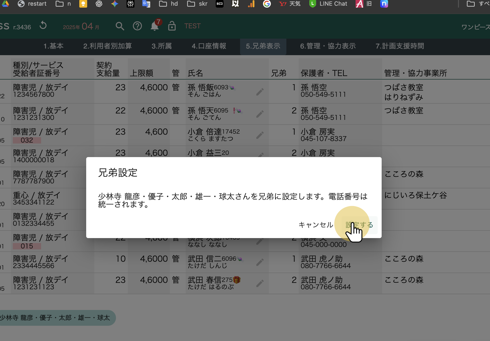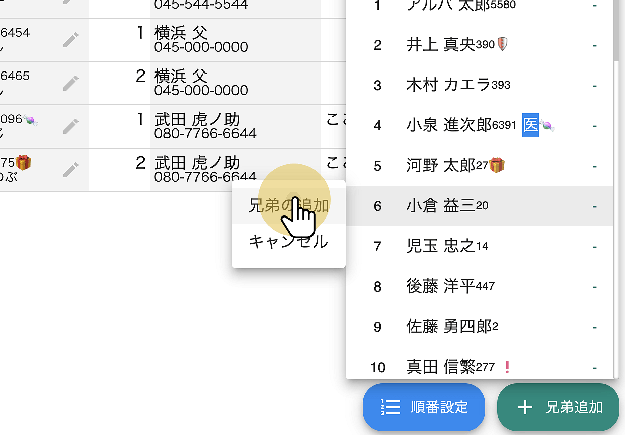 任意の利用者に兄弟を追加出来ます。兄弟は保護者のお名前や電話番号が一致している必要があり、間違えが発生しやすいです。確実に兄弟を追加することが出来ます。