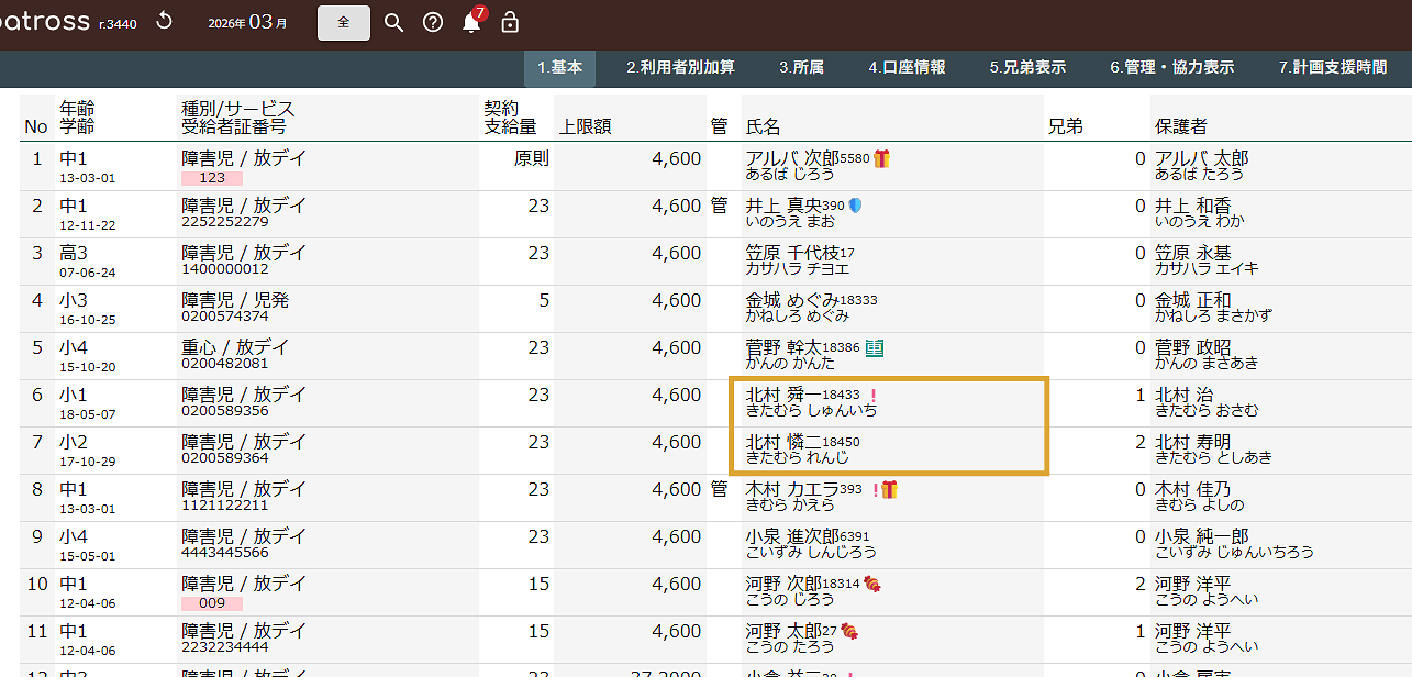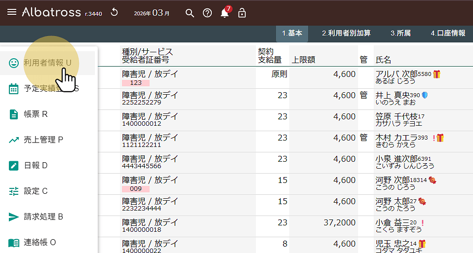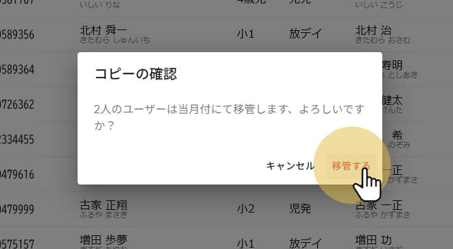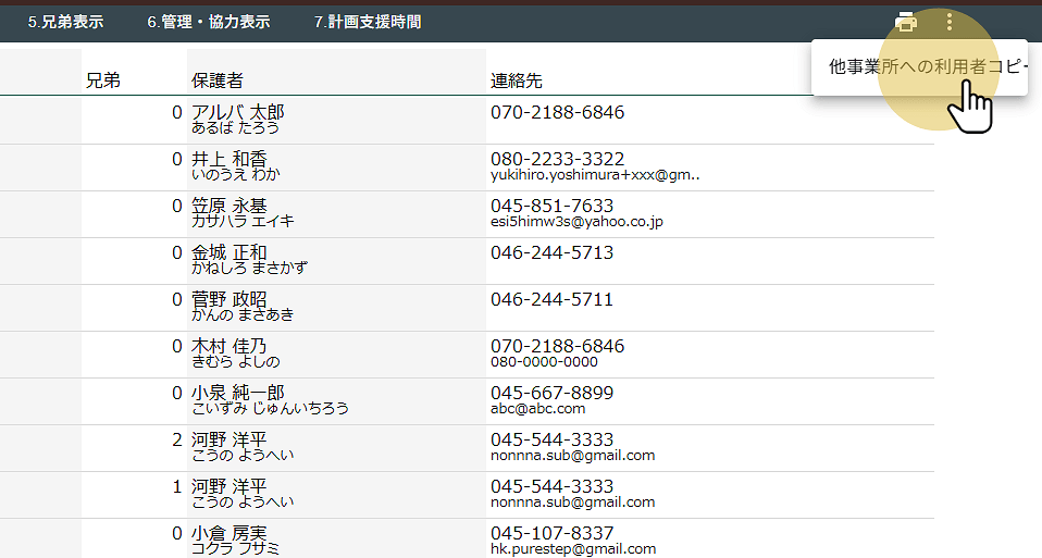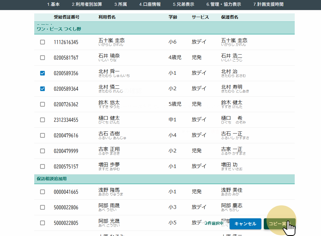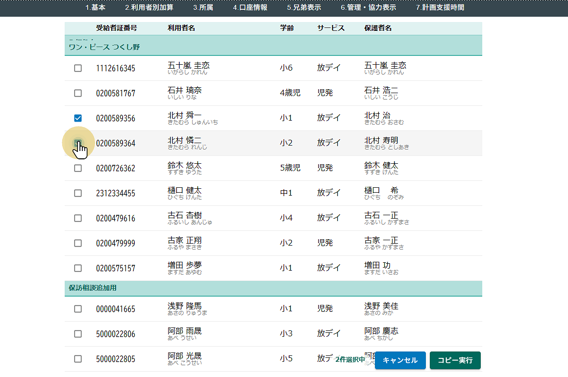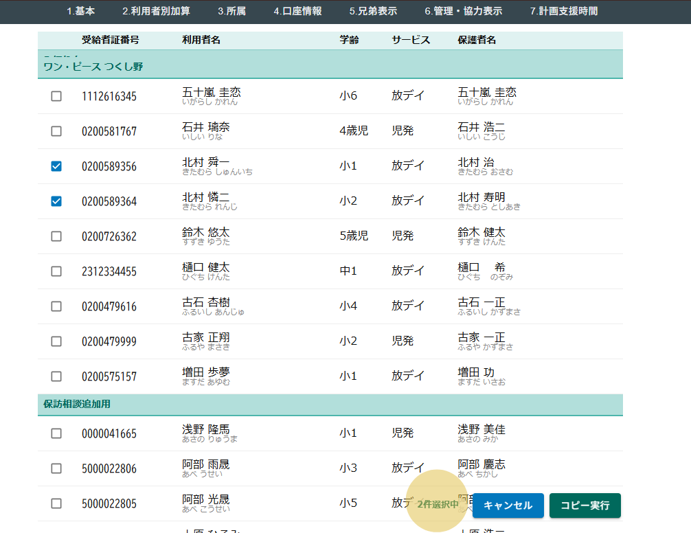 2026年03月12日 お知らせ, ブログ, ヘルプ 複数利用者が存在するアカウントにおいて事業所間の利用者データコピーを行うことが出来ます。コピーは同一法人内のみとなります。 スクリーンショットは開発中のものであり実際のものとは異なります。 メインメニューから利用者情報を選択します。 サブメニューの一番右端、縦三点をクリックしてから他事業所への利用者コピーをクリックします。 コピー可能な利用者が並んでいます。 他事業所に存在して、自事業所に存在しない利用車が表示されています。受給者証番号で利用者を特定しています。 コピーしたい利用者を選んでください。 データが何件選択されているかが表示されます。 コピー実行をクリックします。 内容を確認して「コピー(移管)する」をクリックしてください。 コピーが完了すると利用者情報の画面に移動します。先ほど選択した利用者が追加されていることを確認してください。 #利用者コピー #複写 #事業所間 前の記事: 兄弟の追加・入れ替え・候補の確認 次の記事: 利用者の登録月変更 前の記事 次の記事